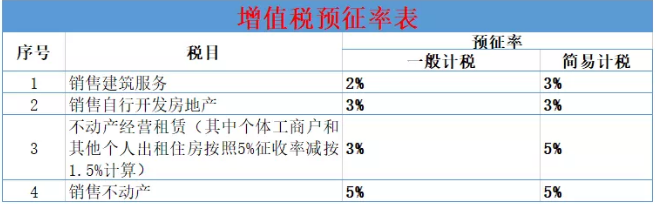 三預征率 預征率有3檔,2%,3%和5%。簡易計稅的預征率基本上與征收率一致。銷售不動產和銷售自行開發房地產的預征率簡易計稅與一般計稅相同。注意:換算成不含稅價時,分母為稅率或征收率,而不是預征率。如納稅人出租不動產適用一般計稅方法計稅的,應預繳稅款=含稅銷售額÷(1+9%)×預征率3%