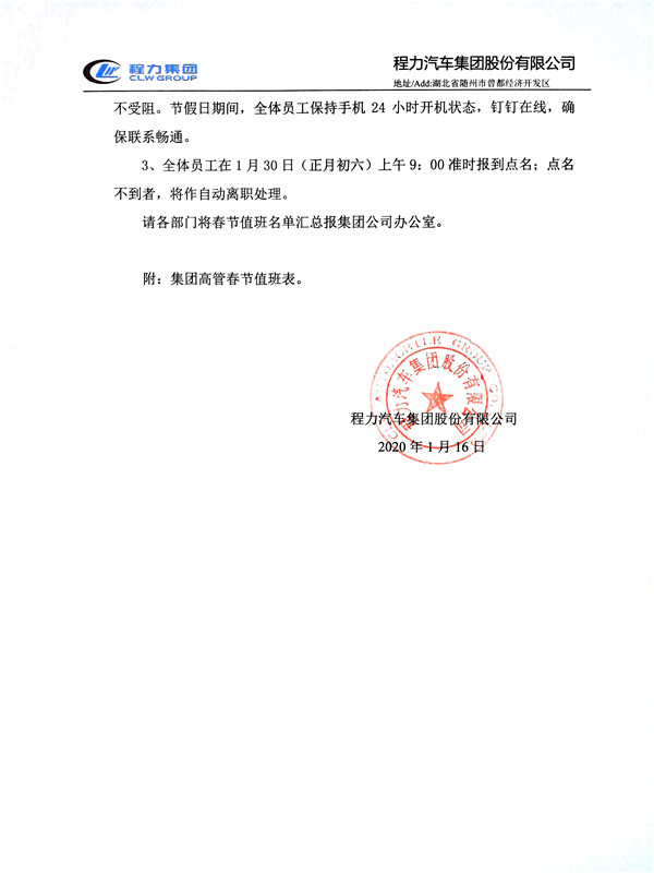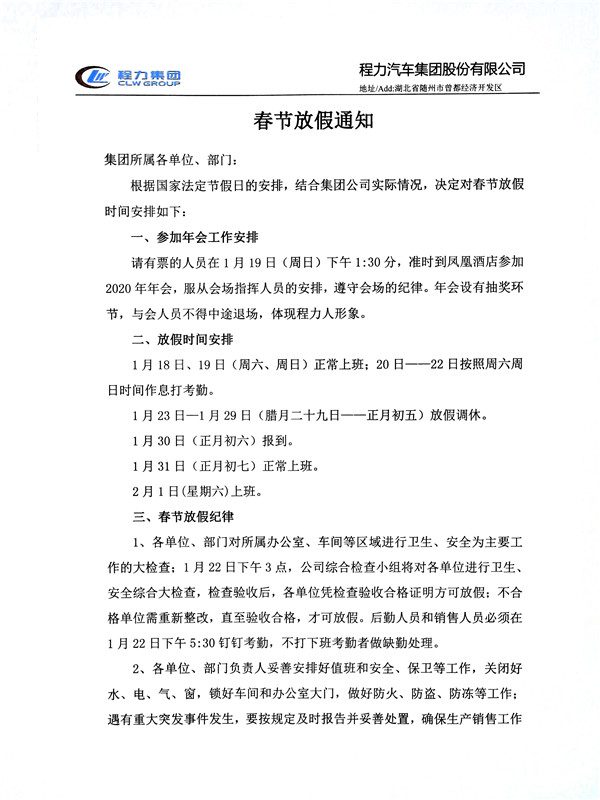 2020年喜迎新春佳節,湖北程力集團專用汽車有限公司春節工作安排: