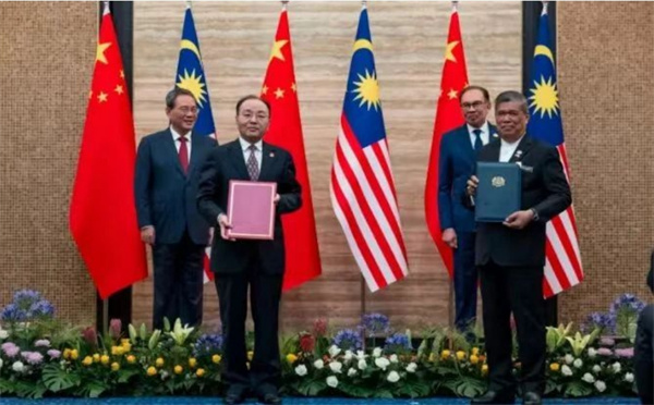 會談后,在兩位領(lǐng)導(dǎo)人的共同見證下,兩國簽署了14項合作協(xié)議和備忘錄,其中包括兩國民眾期待已久的《馬來西亞鮮食榴梿輸華植物檢疫要求議定書》,也意味著馬來西亞新鮮榴蓮可以向中國出口。簽署儀式于今天上午11時許在布城首相辦公室舉行,多位馬來西亞內(nèi)閣部長和中方部長分別代表兩國簽署。