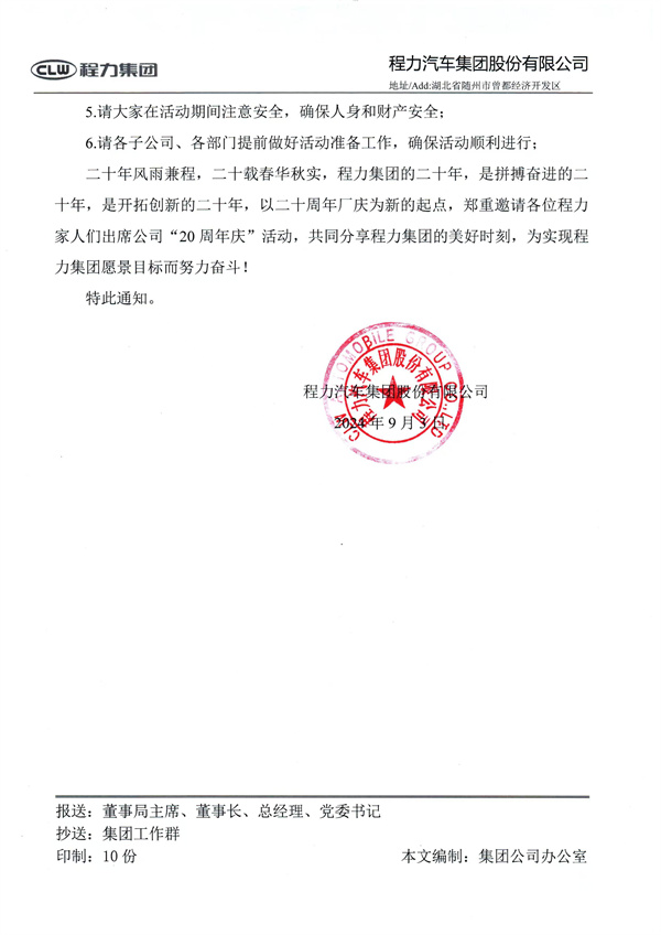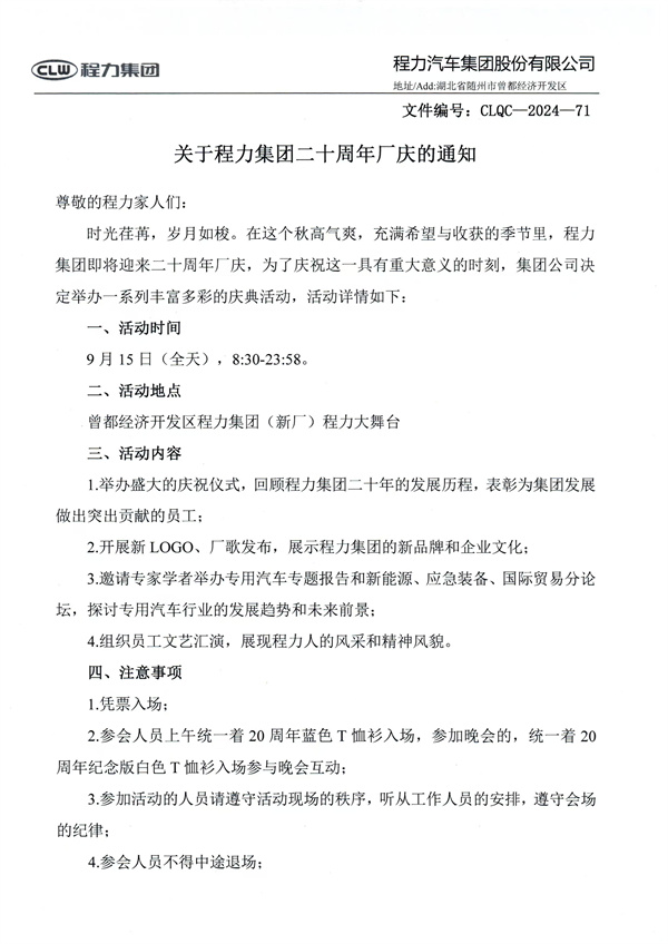 關(guān)于程力集團(tuán)二十周年廠慶的通知 尊敬的程力家人們: 時(shí)光荏苒,歲月如梭。在這個(gè)秋高氣爽,充滿希望與收獲的季節(jié)里,程力集團(tuán)即將迎來(lái)二十周年廠慶,為了慶祝這一具有重大意義的時(shí)刻,集團(tuán)公司決定舉辦一系列豐富多彩的慶典活動(dòng),活動(dòng)詳情如下: 一、活動(dòng)時(shí)間 9月15日(全天),8:30-23:58。 二、活動(dòng)地點(diǎn) 曾都經(jīng)濟(jì)開發(fā)區(qū)程力集團(tuán)(新廠)程力大舞臺(tái) ![]() 三、活動(dòng)內(nèi)容 1.舉辦盛大的慶祝儀式,回顧程力集團(tuán)二十年的發(fā)展歷程,表彰為集團(tuán)發(fā)展做出突出貢獻(xiàn)的員工; 2.開展新LOGO、廠歌發(fā)布,展示程力集團(tuán)的新品牌和企業(yè)文化; 3.邀請(qǐng)專家學(xué)者舉辦專用汽車專題報(bào)告和新能源、應(yīng)急裝備、國(guó)際貿(mào)易分論壇,探討專用汽車行業(yè)的發(fā)展趨勢(shì)和未來(lái)前景; 4.組織員工文藝匯演,展現(xiàn)程力人的風(fēng)采和精神風(fēng)貌。 四、注意事項(xiàng) 1.憑票入場(chǎng); 2.參會(huì)人員上午統(tǒng)一著20周年藍(lán)色T恤衫入場(chǎng),參加晚會(huì)的,統(tǒng)一著20 周年紀(jì)念版白色T恤衫入場(chǎng)參與晚會(huì)互動(dòng); 3.參加活動(dòng)的人員請(qǐng)遵守活動(dòng)現(xiàn)場(chǎng)的秩序,聽從工作人員的安排,遵守會(huì)場(chǎng)的紀(jì)律; 4.參會(huì)人員不得中途退場(chǎng); 5.請(qǐng)大家在活動(dòng)期間注意安全,確保人身和財(cái)產(chǎn)安全; 6.請(qǐng)各子公司、各部門提前做好活動(dòng)準(zhǔn)備工作,確;顒(dòng)順利進(jìn)行; 二十年風(fēng)雨兼程,二十載春華秋實(shí),程力集團(tuán)的二十年,是拼搏奮進(jìn)的二十年,是開拓創(chuàng)新的二十年,以二十周年廠慶為新的起點(diǎn),鄭重邀請(qǐng)各位程力家人們出席公司“20周年慶”活動(dòng),共同分享程力集團(tuán)的美好時(shí)刻,為實(shí)現(xiàn)程力集團(tuán)愿景目標(biāo)而努力奮斗! 特此通知。 ![]() ![]() |