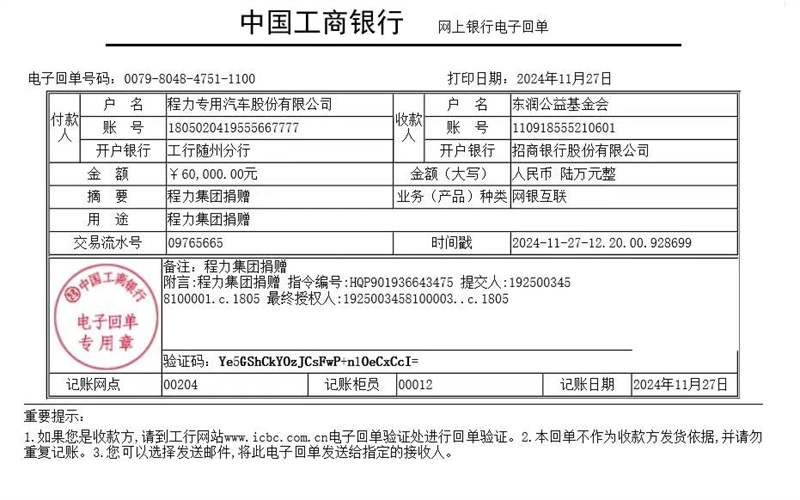 “產業興旺造福一方,托起千萬個夢想”、“深耕沃土實干興邦,共同富裕初心不忘”,“程力人有擔當……”,這是中國民企500強程力汽車集團股份有限公司《程力之歌》中激昂豪邁歌詞的真情流露,也是程力人勇于踐行社會公益事業的真實寫照;程力人20余年來砥礪奮進,始終把公益事業放在集團公司發展的重要位置,堅持做最有溫度最有擔當的愛心企業楷模,程力人公益之路愈久彌新不遺余力,譜寫了一曲曲令人動容的新時代贊歌,那些過往的精彩畫卷仿佛蒙太奇一般呈現在我們眼前。 2024年11月27日,程力汽車集團旗下核心企業----程力專用汽車股份有限公司,向東潤公益基金會捐款60000元,用于弘揚公益精神和助力國家科學人才培育,以及賑災濟難、撫貧濟困、獎教助學,改善經濟欠發達地區青少年的生活、學習條件,幫助其提高自身發展能力,為國家培養具有國際競爭力的新一代人才做貢獻。 這雖然只是區區6萬元愛心捐贈,但它卻是程力汽車集團二十年如一日做公益事業,花費數千萬巨資中的涓涓細流,是聚溪水成滄海的重要源泉,是生命的贊歌,是無私的奉獻;是賑災濟難、扶貧濟困,獎教助學培養人才的大愛善舉,久久為功必成燎原之勢。 上圖:程力汽車集團承接的全國工商聯“萬企興萬村”共建鄉村振興對口幫扶縣----貴州省劍河縣,程力第二批捐贈消防灑水車現場,該縣縣委書記楊勝朝致答謝詞。