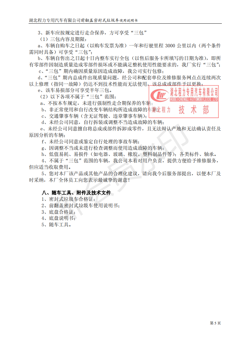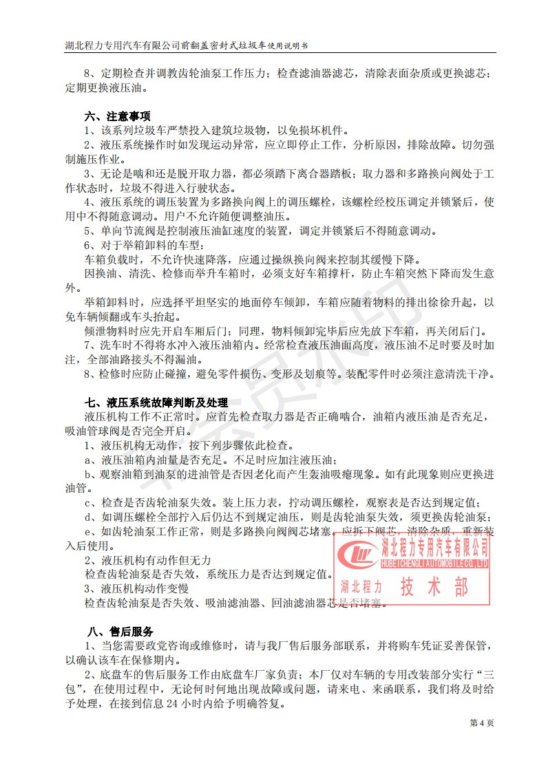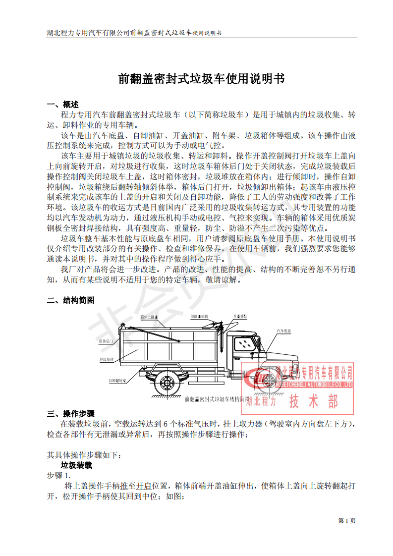 湖北程力密封自卸垃圾車使用維護(hù)說(shuō)明書(程力自卸垃圾車如何使用