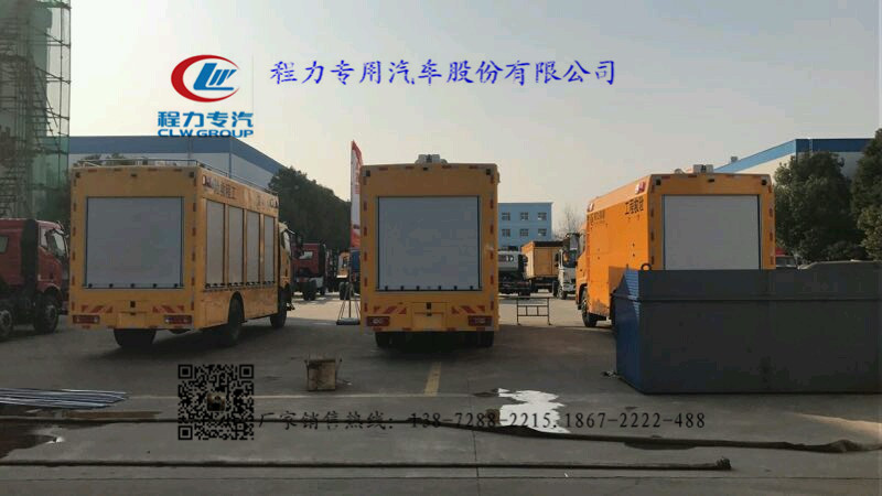 外供電源:箱內配備滿足5KW功率輸出,電壓380V插座一個,220V通用插座一個,長排燈:車頭安裝長排工程燈,帶喊話器。爆閃燈:車輛兩側各配四只共八只紅白爆閃燈,對行人及過往車輛起到示作用。 消防:配兩只手提式干粉滅火器2只,擺放于車上易拿取處。倒車雷達:可視倒車雷達,七寸顯示屏,配4個安全探頭。液壓支撐支:車輛安裝四只液壓支撐腿,可在駐車狀態均分車輛靜壓,保護車輪及彈簧鋼板,選用進口優質意大利多路閥組,液壓支撐缸采用采用進口密封件,單缸靜載荷5噸,加裝雙向液壓鎖。