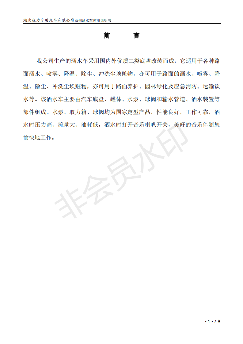 湖北程力專業(yè)生產(chǎn)東風(fēng)小霸王灑水車、東風(fēng)多利卡灑水車、東風(fēng)灑水車、東風(fēng)大金剛灑水車、東風(fēng)140灑水車、東風(fēng)140/47灑水車、東風(fēng)145灑水車、東風(fēng)153灑水車、東風(fēng)1254灑水車、東風(fēng)前四后八灑水車、東風(fēng)天龍灑水車、半掛灑水車、解放系列灑水車、汽油灑水車等各類灑水車。用戶可自帶底盤我廠提供上裝部件的生產(chǎn)改裝。 灑水車前沖(噴)后灑,帶側(cè)噴,罐體后帶工作平臺,平臺上安裝綠化灑水炮,灑水炮可全方位旋轉(zhuǎn),可連續(xù)調(diào)成直沖狀、大雨、小雨、毛毛雨,帶安全護(hù)欄,配備全國質(zhì)量評比第一名的杭州威龍大功率專用灑水泵,泵可自吸自排,安裝過濾網(wǎng),帶消防接口,可通過消防栓進(jìn)水,帶自流閥,隨車選裝20米綠化卷盤,可噴灑農(nóng)藥,罐體金屬漆。 灑水泵情況說明:大功率專用灑水泵,采用國際領(lǐng)先意大利技術(shù),在國內(nèi)生產(chǎn)各系列專用泵已有50年歷史,產(chǎn)品質(zhì)量成熟可靠,設(shè)計(jì)先進(jìn)合理,使用方便快捷,比同類灑水泵壓力大、吸程遠(yuǎn)、使用壽命長,克服其它灑水泵易被雜物纏住、壓力小、吸水慢的缺點(diǎn),引領(lǐng)國內(nèi)外灑水泵行業(yè)標(biāo)準(zhǔn),市場占有率93%。關(guān)于湖北程力灑水車使用說明書介紹如下,用戶不清楚可以直接打印出來。 ![]() ![]() ![]() ![]() ![]() ![]() ![]() ![]() ![]() |