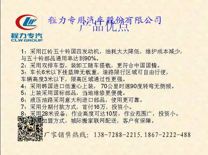 程力公司程力威牌云梯搬家車作業(yè)高度可達(dá)28米,相當(dāng)于10層樓高,云梯車的承載貨物重量每次可達(dá)300公斤,藍(lán)色牌照,C證駕駛室,無(wú)需特種操作證。非營(yíng)運(yùn)車輛,使用期限30年。云梯從韓國(guó)進(jìn)口,底盤(pán)有東風(fēng)雙排座和江鈴雙排座兩種供用戶選購(gòu)。廠家銷售熱線:0722-3220988.0722-7029866 |