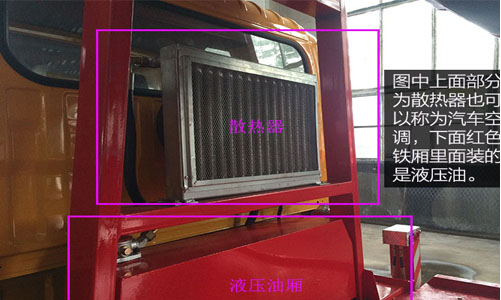 圖中上面部分為散熱器也可以稱為汽車空調(diào),下面紅色鐵廂里面裝的是液壓油。散熱器主要給上裝所有油路管散熱,防止油管加快老化。液壓油廂里的液壓油供給上裝部分所有液壓操作部分使用。