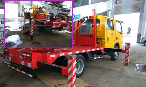后車板安裝四條H型支腿,通過(guò)操作桿液壓控制,可同時(shí)自動(dòng)伸縮。液壓支腿先水平向外伸展然后再垂向下展開(kāi),兩邊完全伸展開(kāi)大約五米左右。液壓支腿控制整個(gè)車的平衡,碳鋼材質(zhì)制成結(jié)實(shí)耐用。