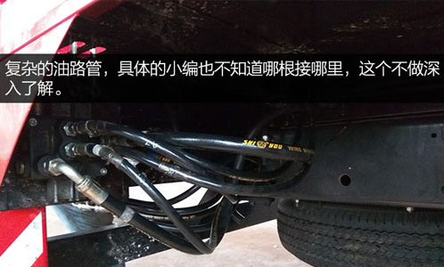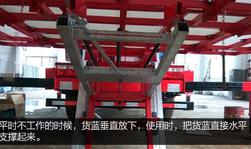 平時(shí)不工作的時(shí)候,貨藍(lán)垂直放下,使用時(shí),把貨藍(lán)直接水平支撐起來(lái)。里面的黑色管路專門(mén)用于支撐貨藍(lán)的小液壓油缸。