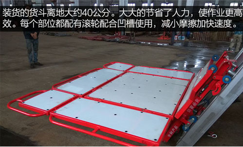 裝貨的貨斗離地大約40公分。大大的節(jié)省了人力,使作業(yè)更高效。每個(gè)部位都配有滾輪配合凹槽使用,減小摩擦加快速度。
