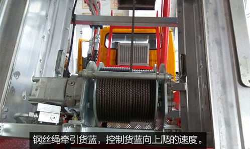 鋼絲繩牽引貨藍(lán),控制貨藍(lán)向上爬的速度。